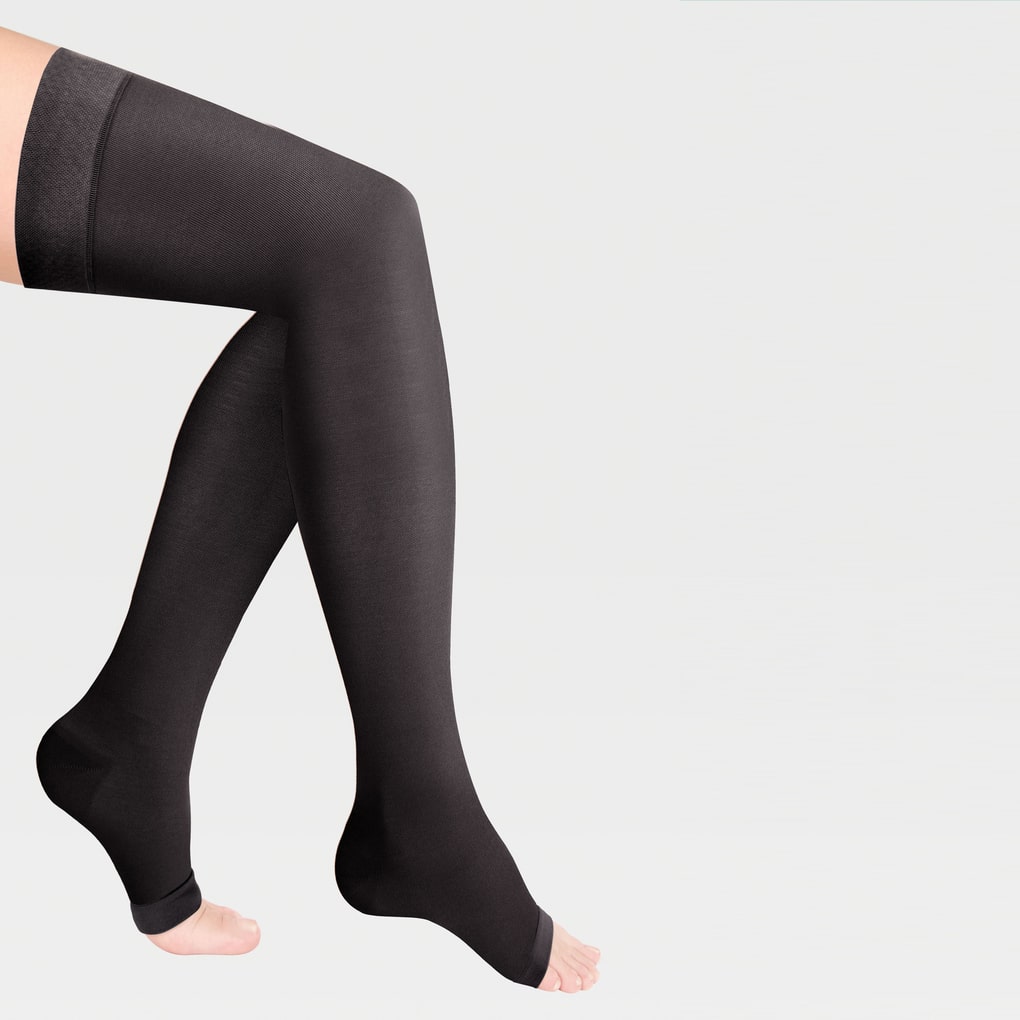 - резинка на силиконовой основе, в том числе на широкое бедро, мягко фиксирует чулок , не нарушая кровотока;