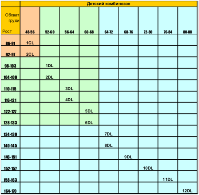Таблица подбора размера костюма Лайт: